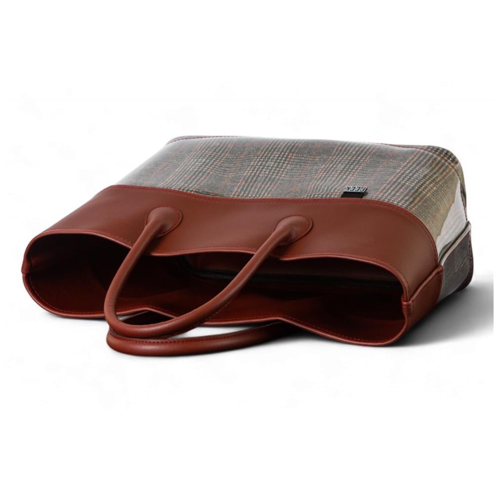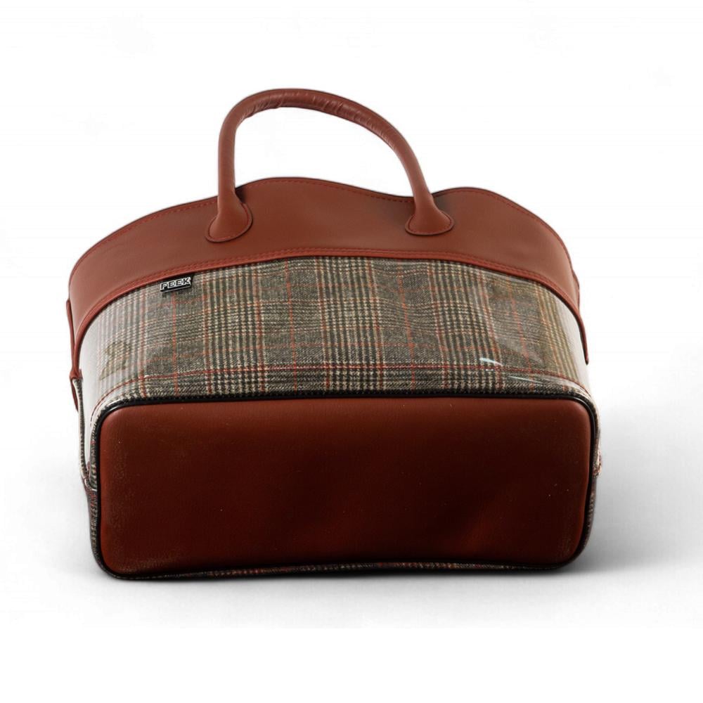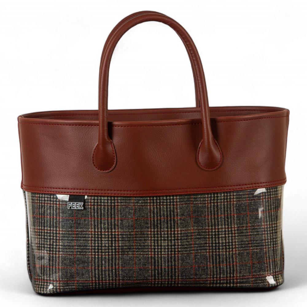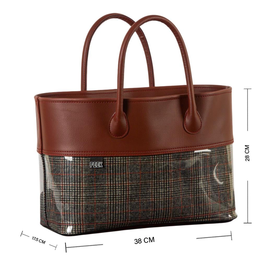 سلة المواسم من ماركة FEEK تجمع بين الأناقة والعملية، بتصميم يجمع الجلد البني الفاخر مع نقشة الكاروهات الملونة داخل غلاف شفاف يمنحها طابعًا عصريًا ومميزًا.